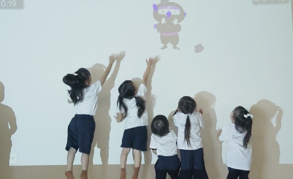 大画面プロジェクターを使い、映像・音・動きが連動するプログラムで、まるでゲームのように楽しく取り組めるのが特徴です。