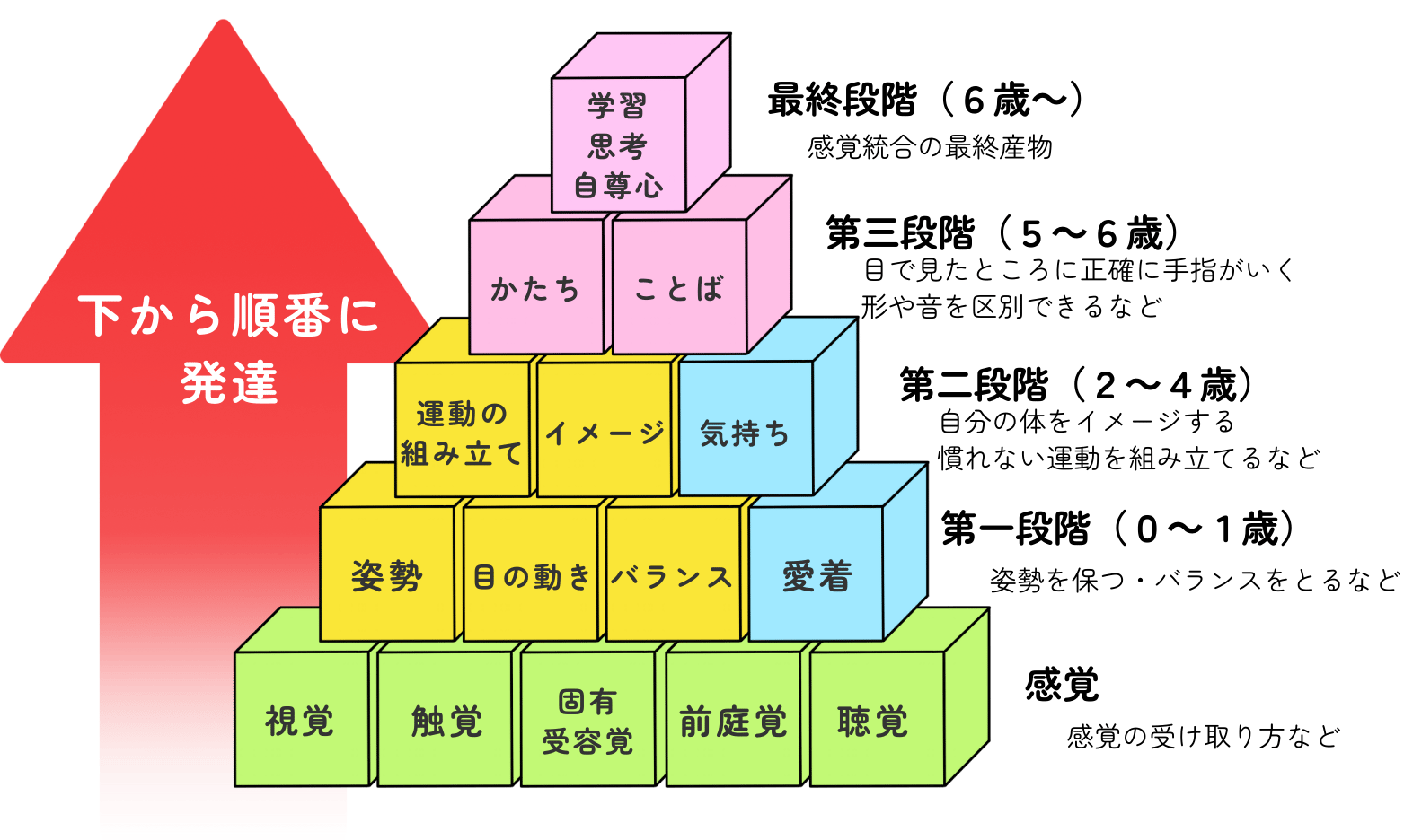 そのうえに、運動の組み立て・イメージ・気持ちのコントロールなどがあり、さらに「かたち」「ことば」→ 最終的に「学習」「思考」へとつながっていきます。